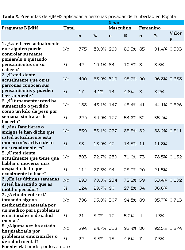 Tabla 5.Preguntas de BJMHS aplicadas a personas privadas de la libertad en Bogotá.