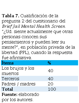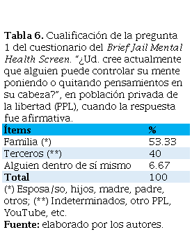 Table 6. Cualificación de la pregunta 1 del cuestionario del Brief Jail Mental Health Screen. “¿Ud. cree actualmente que alguien puede controlar su mente poniendo o quitando pensamientos en su cabeza?”, en población privada de la libertad (PPL), cuando la respuesta fue afirmativa.
