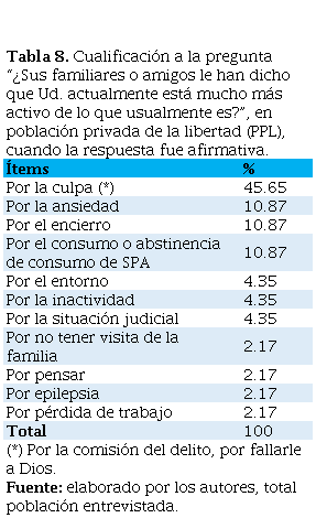 Tabla 8. Cualificación a la pregunta “¿Sus familiares o amigos le han dicho que Ud. actualmente está mucho más activo de lo que usualmente es?”, en población privada de la libertad (PPL), cuando la respuesta fue afirmativa.
