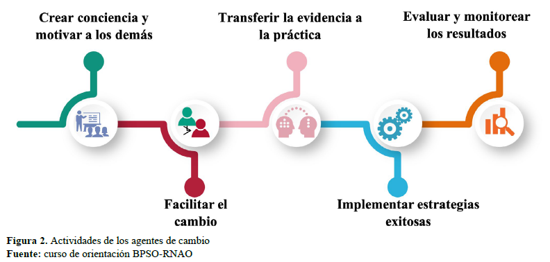 Los Champions BPSO de la RNAO son personas que apoyan el uso de las Guías de Buenas Prácticas (GBP) y otros recursos basados en evidencia para mejorar la práctica clínica y la toma de decisiones, crean conciencia sobre las GBP, apoyan la comprensión e influyen en su adopción entre los compañeros de trabajo. De acuerdo a lo anterior, son merecedores de los siguientes atributos en sus equipos de trabajo: influencia, responsabilidad, presencia, perseverancia, persuasión, con un estilo de liderazgo participativo (5)(Figura 1).