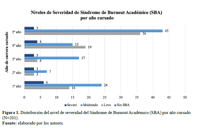 En cuanto a la distribución porcentual, el 100% de la muestra presentó SBA; asimismo, el 52.7% y 9.5% mostró un nivel moderado y severo de SBA, respectivamente. En cuanto a la distribución “severidad” del SBA, se observa que el 1º año muestra el mayor número de estudiantes con SBA severo (Figura 1).