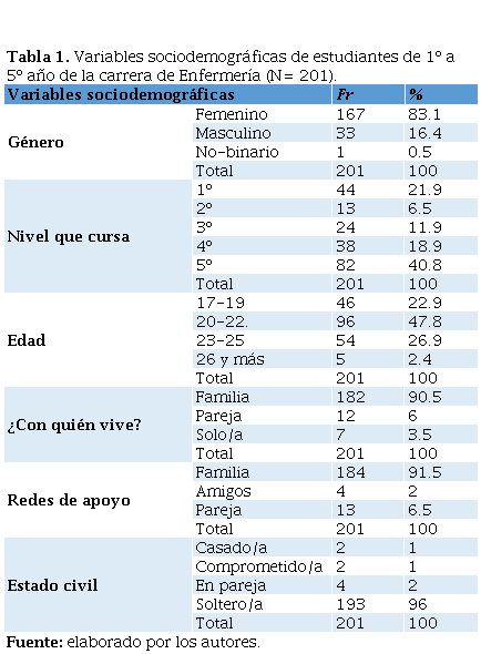 Tabla 1.Variables sociodemográficas de estudiantes de 1º a 5º año de la carrera de Enfermería (N= 201).