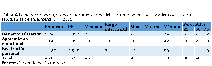 Tabla 2.Estadísticos descriptivos de las dimensiones del Síndrome de Burnout Académico (SBA) en estudiantes de enfermería (N = 201).