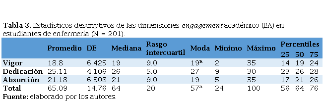 Tabla 3. Estadísticos descriptivos de las dimensiones engagement académico (EA) en estudiantes de enfermería (N = 201).