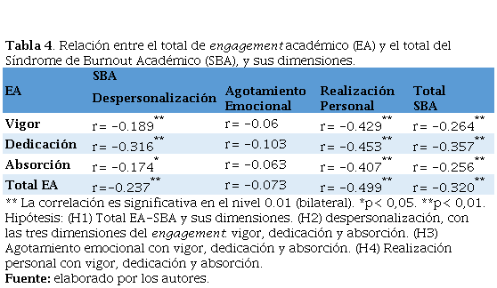 Tabla 4.Relación entre el total de engagement académico (EA) y el total del Síndrome de Burnout Académico (SBA), y sus dimensiones.