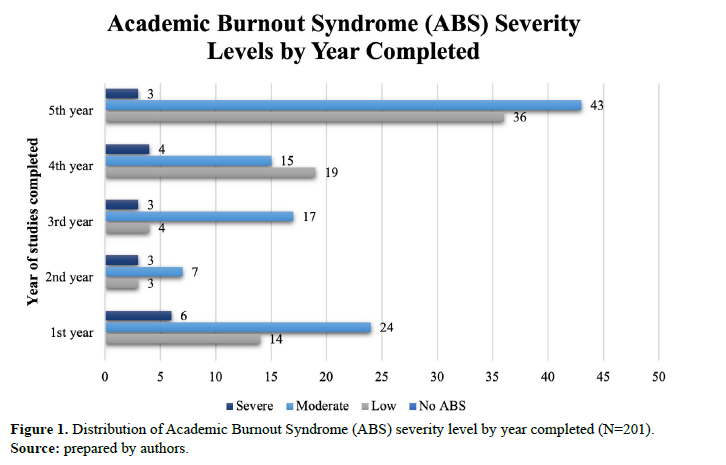 However, our study differs in the dimension of emotional exhaustion, as fifth-year students (Mdn=20.00)(Rq=11) presented lower scores than first-year (Mdn=24.00) (Rq=13.3) and second-year students (Mdn=30.00)(Rq=13.0) (11). This lower emotional exhaustion (fifth year) observed in our study could paradoxically be due to distance education itself, as there was no direct supervision by teachers in the classroom, nor teacher-student interaction. Additionally, the fact that evaluations were also virtual, with the possibility of direct consultation with notes, reduced the emotional pressure conditions associated with these activities in person, as well as the increased free time associated with other losses described previously. Moreover, first and second-year students present higher indices of emotional exhaustion, possibly due to the uncertainty associated with distance education; these courses require fewer laboratories and clinical practices, so the pressure associated with theoretical subjects was not felt. All this could lead to a lack of enthusiasm and concentration in the course, leading to inappropriate behaviors such as playing with mobile phones, falling asleep, and being absent from learning (19). This inevitably influences psycho-affective experiences and high ABS indices, associated with the new pandemic and DE scenario.