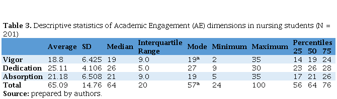 Table 3.Descriptive statistics of Academic Engagement (AE) dimensions in nursing students (N = 201)