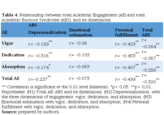 Table 4.Relationship between total Academic Engagement (AE) and total Academic Burnout Syndrome (ABS), and its dimensions.