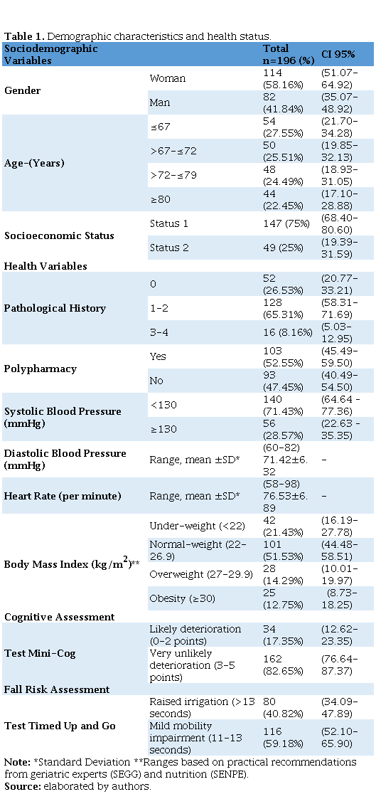 Summary descriptive statistics are presented inTable 1. The average age was 72.91 years (SD±7.88). Of the 196 participants, 58.16% were women, and 41.84% were men; all belonged to the lowest socioeconomic stratum (less than base income). Regarding their state of health, 65.31% have between 1-2 pathological antecedents; the most frequent is High Blood Pressure (HBP) (42.35%; CI 95%: 35.56-49.43), hyperlipidemia (26.53%; CI 95%: 20.77-33.21) and the non-insulin dependent Diabetes Mellitus (15.82%; CI 95%: 11.31-21.67).