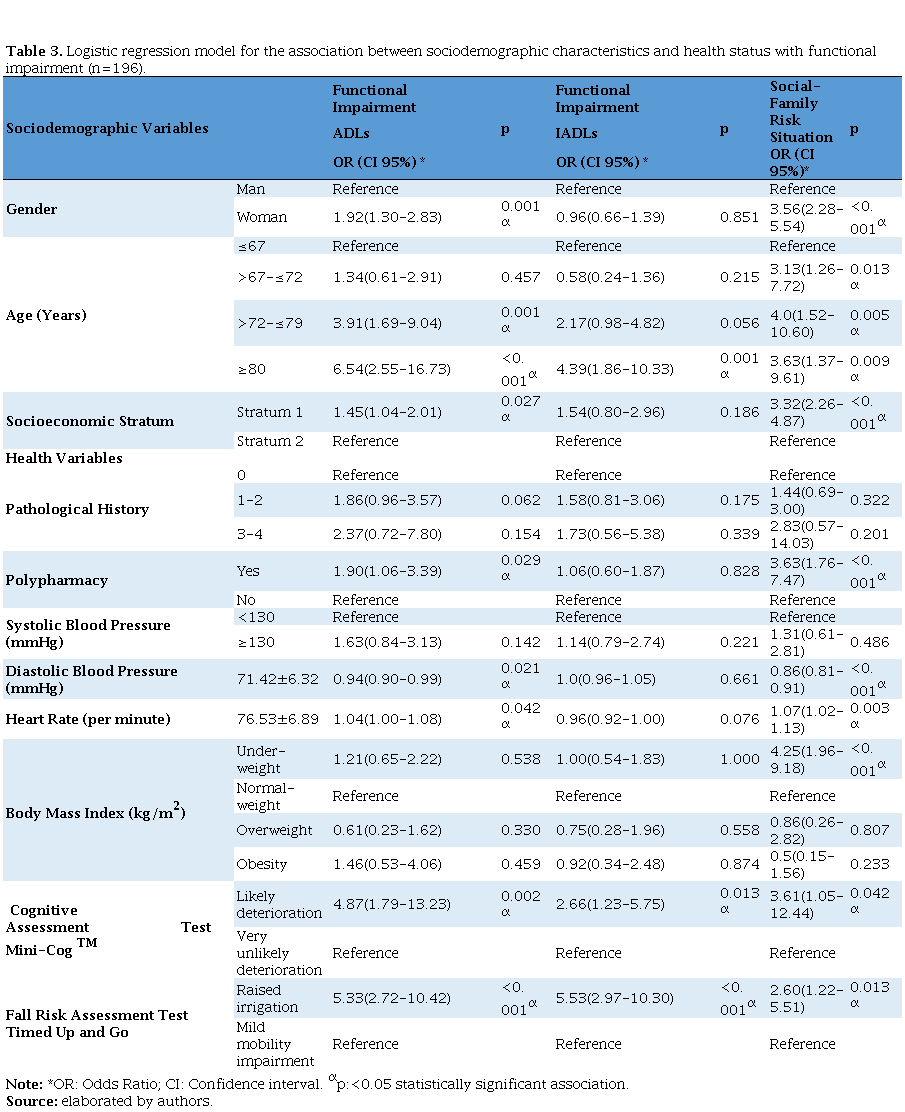 The results suggest an association between age and limitation functional for ADLs, IADLs, and socio-family risk, being higher for the age group ≥80 years (OR 6.54; CI 95%: 2.55-16.73), (OR 4.39; CI 95%: 1.86-10.33), (OR 3.63; CI 95%: 1.37-9.61), respectively.