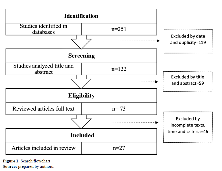 As part of the eligibility process, the abstracts of the articles were read, where fulfillment of the inclusion criteria was recognized: original articles and reviews, with full text available online, written in English, Spanish, Portuguese and French between 2019 and 2021. The following were considered as exclusion criteria: abstract, book chapters and editorials.