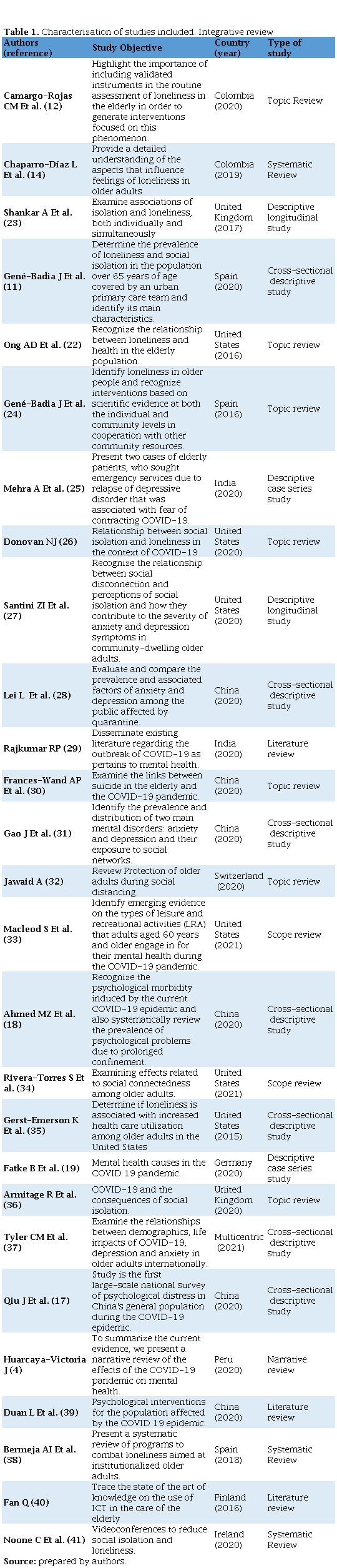 The search strategy developed in the databases Web of Science, Medline (PubMed), SCOPUS, EMBASE, CINAHL, considered the thesauri MeSH and Emtree and the Boolean connectors (AND/ OR): “loneliness”, “elderly”, “Aged”, “Isolating”, “Social Isolation”, “COVID-19” and “Coronavirus Infections”. The CASPe (Critical Appraisal Skills Programme español) templates were implemented to verify the methodological quality of the articles.