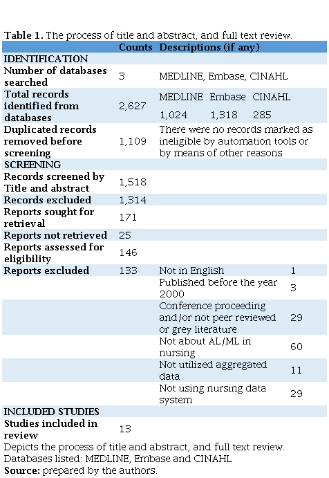 Abstract: Introduction. Artificial intelligence and machine learning are technologies that assist in uncovering patterns in data that can inform clinical decision-making. The Registered Nurses’ Association of Ontario has used artificial intelligence techniques to assist in understanding impactful clinical practices and implementation strategies. This scoping review aimed to discover the adaptation and implementation of various artificial intelligence and machine learning techniques in various healthcare settings using different data systems that house nursing-related data. Methodology. In March 2022, a scoping review was conducted to search for peer-reviewed literature using the following terms: “nursing”, “artificial intelligence”, “data systems”, “statistics”, and “aggregated data”. Studies were excluded if they were not relevant to nursing, utilized qualitative or mixed-methods analyses, were literature review articles, and did not focus on artificial intelligence or the use of patient-level data. Results. A total of 2,627 articles were retrieved, with 1,518 articles remaining after de-duplication. Through title and abstract screening, 1,347 articles remained. Following the full-text screening, 13 studies remained. Artificial intelligence techniques used by healthcare data systems include regression, neural networks, classification, and graph-based methods, among others. Discussion. There is a gap in the application of artificial intelligence methods in data systems that evaluate the impact of implementing best practices in nursing. More data systems are needed that employ artificial intelligence techniques to support the evaluation of best practices in nursing and other health professions. Conclusions. Various artificial intelligence techniques in data systems housing nursing-related data were retrieved. However, more data systems and research are needed in this area.