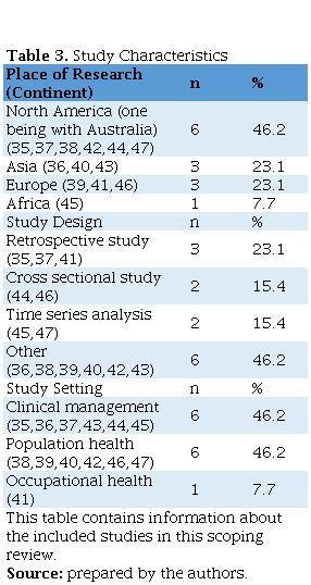 Source: prepared by the authorsThese 13 articles were based on different AI and ML research studies from the following countries: United States (38.5%, n=5, with one being in collaboration with Australia); China (7.7%, n=1); Switzerland (7.7%, n=1); South Korea (7.7%, n=1); Austria (7.7%, n=1); Canada (7.7%, n=1); India (7.7%, n=1); Mozambique (7.7%, n=1); and Italy (7.7%, n=1). The focus of these studies included clinical management of medical conditions (46.2%, n=6), population health (46.2%, n=6), and occupational health (7.7%, n=1). Further information about the included studies can be found in Tables 2and 3.