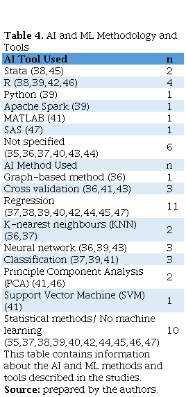 Source: prepared by the authorsThis table contains information about the AI and ML methods and tools described in the studies.