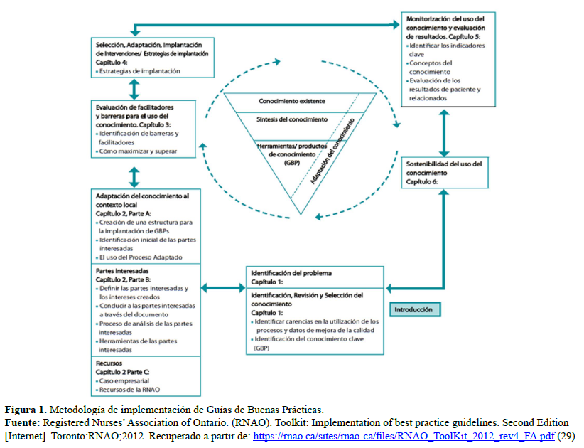 La implementación de las guías de buenas prácticas es eficaz para mejorar la práctica clínica y reducir la variabilidad clínica (25). Las Guías de Buenas Prácticas de la RNAO® están implantadas en España desde 2012 siguiendo los principios del programa canadiense de las Best Practice Spotlight Organisations. (BPSO®) (26,27).