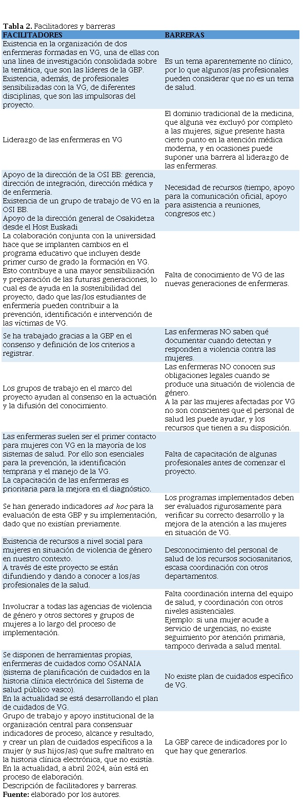 Segunda y tercera etapa. Se realizó la identificación de las barreras y facilitadores. En primer lugar, se realizó una revisión de la literatura para actualizar y adecuar al contexto sociosanitario del País Vasco las recomendaciones. Posteriormente, los líderes del proyecto global a través de diferentes reuniones de trabajo en las que se incluyeron a la dirección y grupo de VG de la organización identificaron las diferentes partes interesadas (Stakeholders). Se realizaron diferentes talleres con las y los impulsoras/es, donde se identificaron las barreras y facilitadores. Como barreras a destacar, se señala la falta de formación específica, y la oferta educativa tradicional durante los estudios de grado. También, el desconocimiento de los recursos sociosanitarios y el margen de mejora existente en la comunicación y coordinación con estos agentes(Tabla 2).