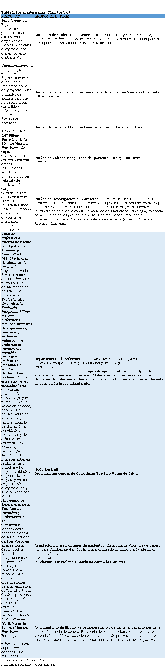 La primera etapa del proceso de implementación se denomina identificación del problema. En la segunda etapa, es necesario adaptar el conocimiento al contexto local. En esta etapa ha sido necesario revisar y actualizar la propia definición de maltrato a las mujeres que se recoge en la guía de acuerdo con la legislación vigente de nuestro país (25). Así, la denominación de VG se ha ampliado e incorporado a dicha definición a todas las personas contra las que se ejerce el maltrato: las mujeres, sus hijos e hijas. Se ha incorporado también la guía de actuación para profesionales de la salud ante la VG y las agresiones sexuales en Euskadi (31) y el protocolo desarrollado por la OSI Bilbao Basurto en colaboración con los Ayuntamientos de Bilbao y de Alonsotegui de VG y las agresiones sexuales (32). En esta etapa del proceso de implementación, se identificaron también los stakeholders.