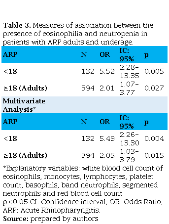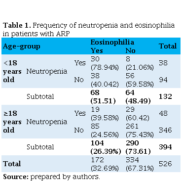 Table 3. Measures of association between the presence of eosinophilia and neutropenia in patients with ARP adults and underage.