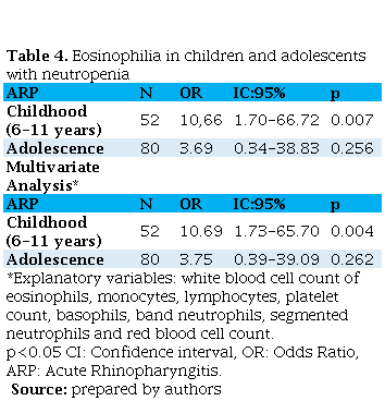 Source: prepared by authors.* Explanatory variables: white blood cell count of eosinophils, monocytes, lymphocytes, platelet count, basophils, band neutrophils, segmented neutrophils and red blood cell countChildren with neutropenia and ARP had eosinophilia 10 times more often than children without neutropenia (OR:10.66; CI (95%)=1.70-66.72; p=0.007). The result was not statistically significant in adolescents with ARP and eosinophilia (p=0.256; CI:95%= 0.34- 38.83) (Table 4).