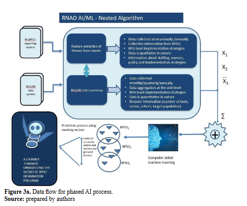 Phase 1: RNAO is likely to address the significant time of nurses, optimize healthcare operations, and increase the adoption of evidence-based nursing practice. Certain approaches in this phase include applications (18) that power nursing in health care delivery – from the front lines to health system management levels – and lead to better patient care and health outcomes. Broader approaches to AI link natural language processing (NLP), ML, and deep learning (DL). Figures 3aand 3bdescribe an overview of the nested algorithm developed for the phase 1 approach to developing the AI tool for BPSOs.
