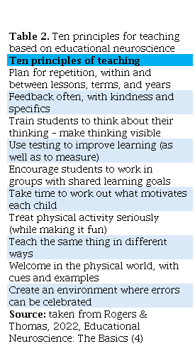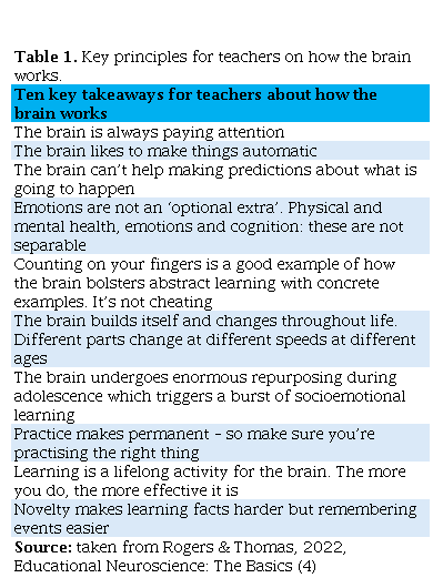 Of course, teachers already have some knowledge from cognitive psychology. Typically, this involves a focus on memory, and the ways that knowledge from teachers can be transferred to students’ long-term memories. This perspective focuses on factors such as students’ prior knowledge, methods to convey knowledge in a way that does not exceed presumed limits on the students’ working memories, schedules to present the knowledge via repetition or interleaving material to optimise its encoding, and ways to ensure retention, such as practising retrieval of information. For example, this type of cognitive framing is prominent in the UK government’s document on what teachers should know about how learning works (1). In the current article, I will argue that this is a good start, but that teachers’ practice can be enriched by the broader understanding of factors that influence learning provided by neuroscience.