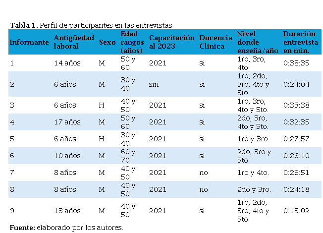 Se utilizó una entrevista semiestructurada, aplicada cara a cara en un espacio privado de la UDP o en línea, con el objetivo de profundizar en aspectos subjetivos del proceso. Se seleccionaron por conveniencia a nueve docentes, todos licenciados en Enfermería y magíster, con distintos niveles de involucramiento en la docencia, excluyendo a académicos con menos de dos años en la escuela y a supervisores externos. Antes de cada entrevista, los participantes firmaron un consentimiento informado. Las entrevistas, con una duración total de 4 horas y 12 minutos, fueron anonimizadas, transcritas mediante inteligencia artificial (IA) y revisadas manualmente para asegurar su precisión (Tabla 1).