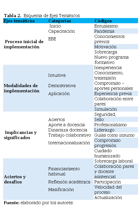 Los resultados se presentan agrupados en torno a cuatro ejes temáticos, a saber: el proceso de inicio del proyecto, la estrategia de implementación utilizada, la experiencia de los profesores informantes y aciertos y desafíos enfrentados. (Figura 1 y Tabla 2)