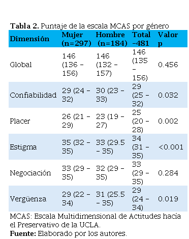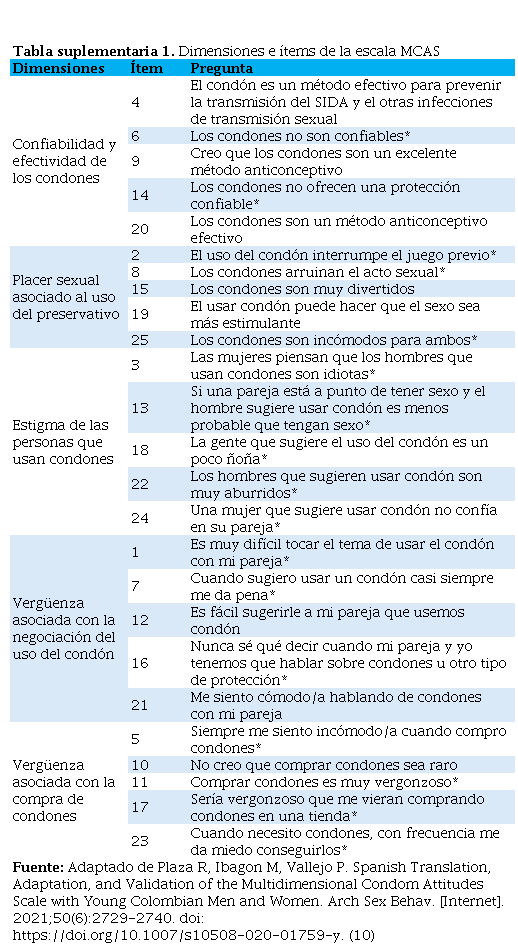 Se estableció como variable dependiente el puntaje general de la Escala Multidimensional de Actitudes hacia el Preservativo de la UCLA (MCAS) (10), la cual consta de cinco dimensiones: confiabilidad y efectividad de los preservativos; placer sexual asociado con el uso del preservativo; estigma de las personas que usan preservativos; vergüenza asociada con la negociación del uso del preservativo; y vergüenza asociada con la compra de preservativos. Cada dimensión contiene cinco preguntas, sumando un total de 25 ítems evaluados mediante una escala tipo Likert de 1 a 7, con un puntaje máximo de 175 puntos (Tabla suplementaria 1). Como variables independientes se recolectaron datos socioeconómicos, educativos, conducta y orientación sexual.