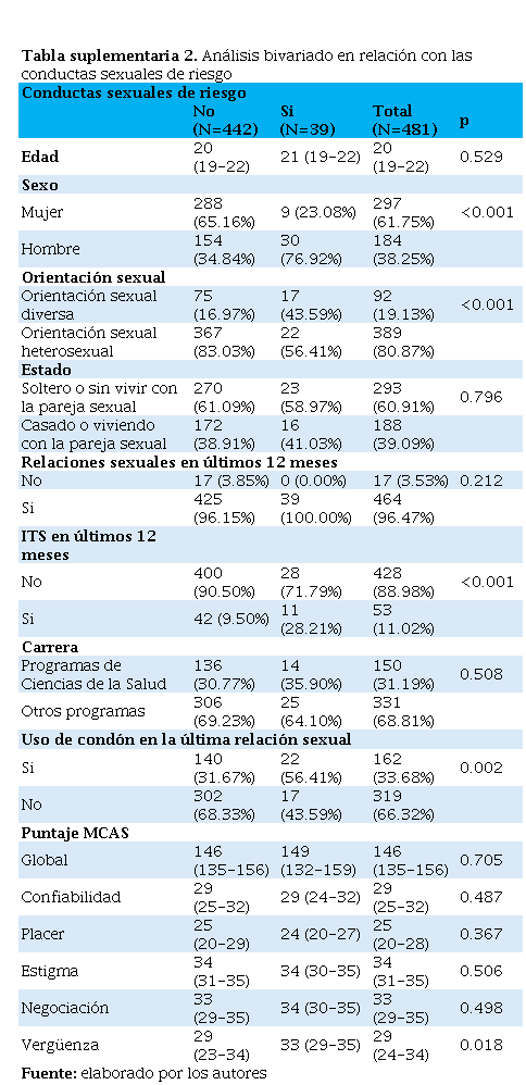 Abstract: Introduction. Condom use is crucial for preventing sexually transmitted infections and unwanted pregnancies. Given the low prevalence of condom use among university students, the objective of this study is to identify the factors associated with condom use among undergraduate students at a university in Santander. Methodology. Descriptive cross-sectional study. Undergraduate students from different programs at a university, aged between 18 and 25, who were sexually active, were included. The Multidimensional Scale of Attitudes toward Condoms and sociodemographic variables were applied using LimeSurvey. Results. Of 481 students, 33.68% used a condom during their last sexual encounter, and 8.12% engaged in risky sexual behavior. The median score on the scale was 146 (IQR: 135-156), with better attitudes toward condom use among health students (p=0.03) and among a diverse population toward pleasure (p=0.12). Being male (p<0.001) and having a diverse sexual orientation (p<0.001) were associated with risky behavior. Discussion. A low prevalence of condom use was found, similar to that reported by Camacho et al. High overall scores were similar to findings by other authors. The importance of sex education in university settings to reduce risky behaviors is highlighted. Conclusion. Condom use among university students was associated with factors such as gender, marital status, sexual orientation, academic program, and attitudes toward pleasure and shame, highlighting the need for differentiated educational interventions.
