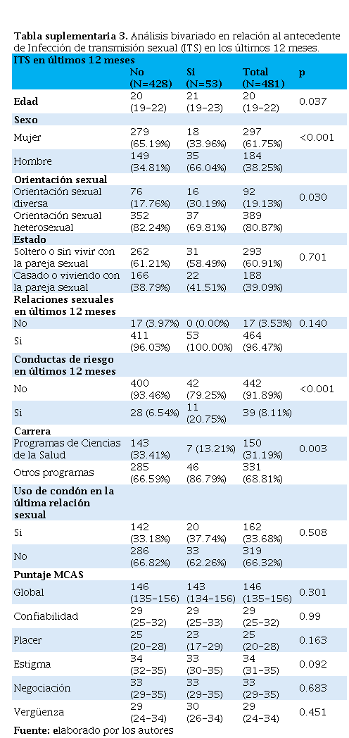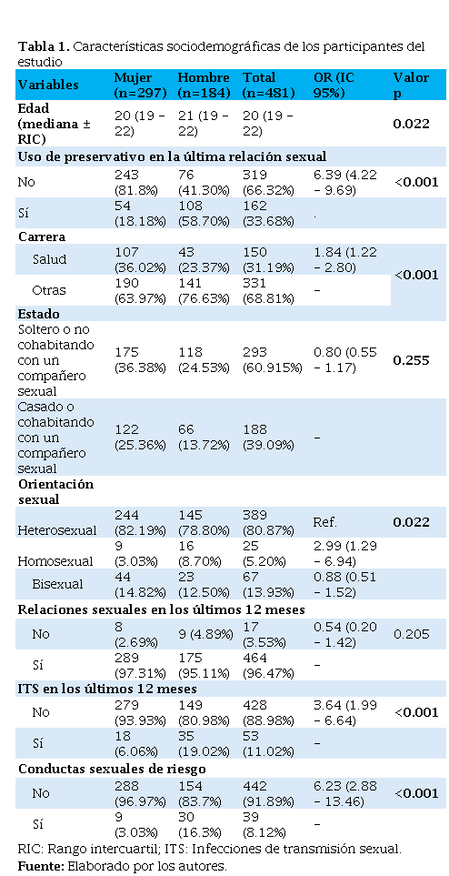 El 33% de los encuestados usó preservativo en su última relación, siendo significativamente mayor el porcentaje en hombres (58.7%) frente a las mujeres (18.2%). En su mayoría, los estudiantes eran solteros o no cohabitaban con un compañero sexual (60.92%), heterosexuales (80.9%) y habían tenido relaciones sexuales en el último año (96.5%). El 11.02% había sufrido de una ITS en el año previo, y el 8.12% había tenido conductas sexuales de riesgo (sexo con >2 personas, que se inyectan drogas o VIH positivas, o intercambió de sexo por dinero o drogas), siendo significativamente mayor en los hombres, en ambos casos (Tabla 1).