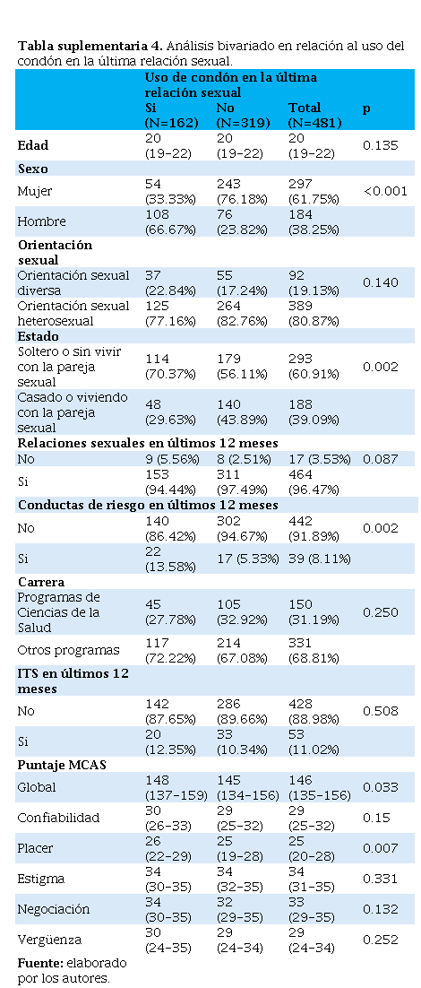 Resumo: Introdução. O uso do preservativo é fundamental para prevenir infecções sexualmente transmissíveis e gravidez indesejada. Dada a baixa prevalência do uso do preservativo na população universitária, o objetivo deste estudo é identificar fatores associados ao uso do preservativo entre estudantes de graduação de uma universidade em Santander. Metodologia. Foi realizado um estudo descritivo transversal. Foram incluídos estudantes de graduação de diferentes cursos de uma universidade, com idades entre 18 e 25 anos e vida sexual ativa. A Escala Multidimensional de Atitudes em Relação ao Preservativo e as variáveis sociodemográficas foram avaliadas por meio do LimeSurvey. Resultados. Dos 481 estudantes, 33.68% usaram preservativo na última relação sexual e 8.12% apresentaram comportamentos sexuais de risco. A mediana da pontuação na escala foi de 146 (IIQ: 135-156), com atitudes mais favoráveis em relação ao uso de preservativo entre estudantes da área da saúde (p = 0.03) e entre populações diversas em relação ao prazer (p = 0.12). Ser do sexo masculino (p < 0.001) e ter orientação sexual diversa (p < 0.001) estiveram associados a comportamentos de risco. Discussão. Foi encontrada uma baixa prevalência do uso de preservativo, semelhante ao encontrado por Camacho et al. Os altos escores gerais também corroboram os achados de outros autores. Destaca-se a importância da educação sexual em ambientes universitários para reduzir comportamentos de risco. Conclusão. O uso de preservativo entre estudantes universitários foi associado a fatores como sexo, estado civil, orientação sexual, programa acadêmico e atitudes em relação ao prazer e à vergonha, destacando a necessidade de intervenções educacionais direcionadas.