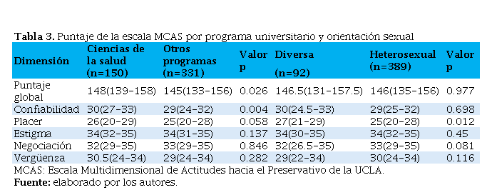 Los estudiantes de ciencias de la salud obtuvieron un mejor puntaje global frente a los otros programas (p=0.03), con actitudes significativamente mejores para la confiabilidad (p=0.01). Al comparar los resultados de acuerdo a la identidad sexual, no se encontraron diferencias significativas (p=0.977), pero la población diversa sí tuvo actitudes más favorables hacia el placer (p=0.012) y mayor confiabilidad, aunque no significativa (Tabla 3).