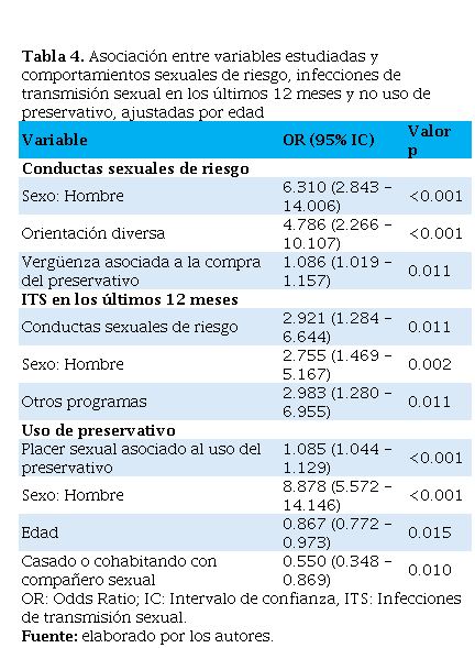 En el modelo de regresión logística se encontró que ser hombre (p<0.001), tener una orientación sexual diversa (p<0.001) y poseer vergüenza al momento de comprar preservativos (p=0.01), se asocian, significativamente, con tener conductas sexuales de riesgo. Con respecto al riesgo de tener una ITS en el último año, las conductas sexuales de riesgo tuvieron un OR de 2.85 (p=0.012), ser hombre un OR de 2.83 (p=0.001), y no pertenecer a programas de la salud presentó un OR de 3.12 (p=0.01). Por otro lado, los mayores puntajes en la dimensión de placer asociado al uso del preservativo y ser hombre, aumentaban el riesgo de usar preservativo (p<0.001). En contraste, la edad y estar casado, se asociaban a un menor uso del preservativo con un OR de 0.867 y 0.55, respectivamente (Tabla 4) (Tablasuplementaria2 - 4).