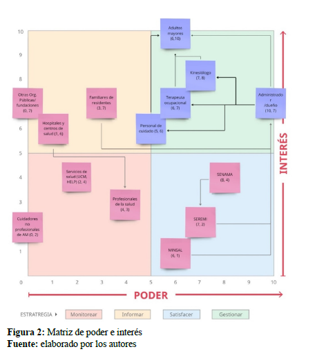 El estudio fue aprobado por el Comité de Ética Institucional de la Universidad de Santiago de Chile. Además, el protocolo completo del estudio (incluidos todos los instrumentos, procedimientos y fases de validación) recibió aprobación formal mediante el Informe Ético n.º 263/2020. El mapa de actores y la matriz de poder/interés que orientaron la priorización de entrevistas y focos de intervención se presentan en la Figura 1 y Figura 2. Se obtuvo consentimiento informado escrito de todos los participantes. No se utilizó información clínica sensible ni identificable de residentes de los ELEAM, así como los datos fueron tratados bajo estrictos principios de confidencialidad y anonimización.