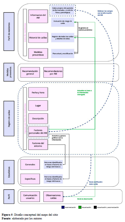 Estos requerimientos sirvieron de base para el diseño de un PMV, es decir, una versión inicial y funcional del sistema con las características mínimas necesarias para ser probado por usuarios reales. Esta estrategia permitió una validación iterativa del desarrollo, siguiendo principios de diseño centrado en el usuario y metodologías ágiles (28). La derivación de elementos mínimos del PMV se ilustra en la Figura 4 y el mapa del sitio en la Figura 5.
