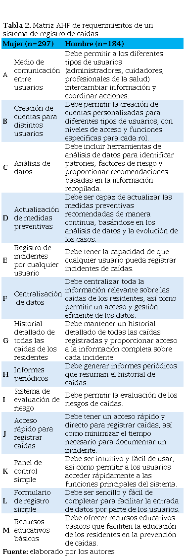 Tabla 2.Matriz AHP de requerimientos de un sistema de registro de caídas