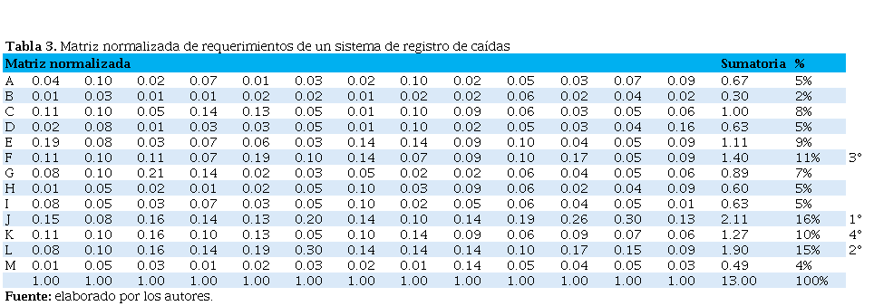Tabla 3. Matriz normalizada de requerimientos de un sistema de registro de caídas