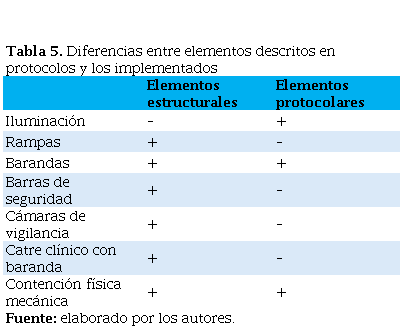 Los sistemas actuales presentan inconsistencias en terminología, datos faltantes y desalineación con protocolos nacionales, lo que limita la toma de decisiones informadas. Este déficit fomenta prácticas rutinarias inadecuadas y aumenta el riesgo de caídas, como lo han advertido otros investigadores en contextos similares. Las discrepancias observadas entre elementos protocolares y elementos estructurales efectivamente implementados durante el levantamiento se sintetizan en la Tabla 5, lo que evidencia oportunidades de mejora en infraestructura y equipamiento.
