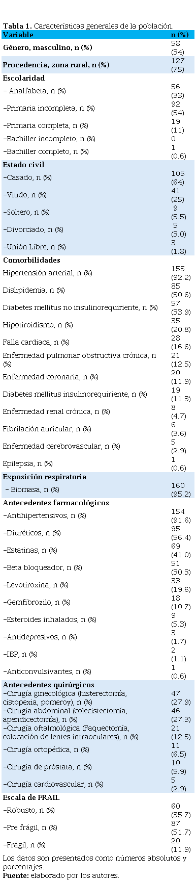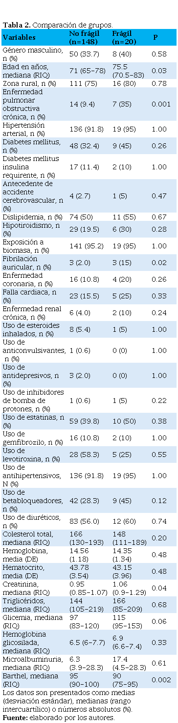 Se incluyeron un total de 168 pacientes durante el período evaluado. El 66% de los pacientes eran de género femenino. El 75% de los pacientes procedían de área rural. La prevalencia de fragilidad fue del 11.9%. La mediana de edad para pacientes frágiles fue de 75.5 años (RIQ 70.5- 83) y en pacientes no frágiles fue de 71 años (RIQ 65-78, p<0.03). La comorbilidad más frecuente fue hipertensión arterial en un 92.26%. Las demás características sociodemográficas se describen en la Tabla 1.