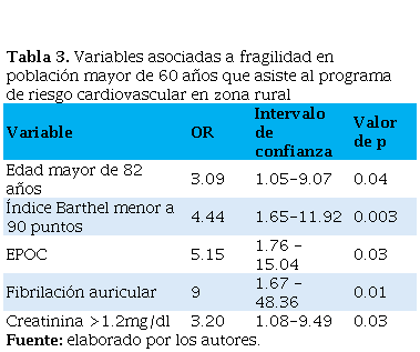 Tabla 3. Variables asociadas a fragilidad en población mayor de 60 años que asiste al programa de riesgo cardiovascular en zona rural