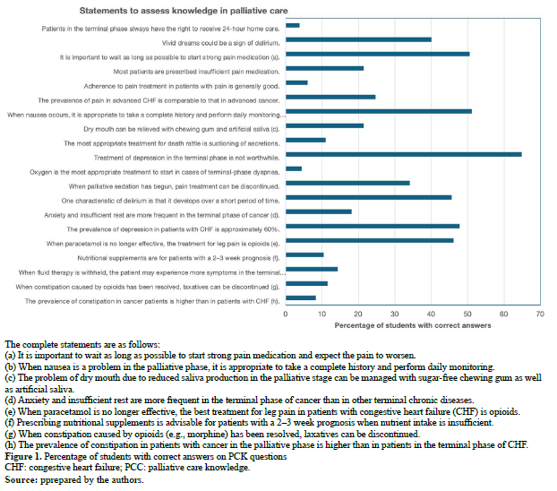 Although in the study by Robledo-Muñoz et al. (11) the proportion of students with satisfactory PCK was similar to that observed in the present study, the specific aspects of PC knowledge evaluated differ considerably. In this study, the Rotterdam MOVE2PC scale was used, which includes, within the PCK dimension, aspects related to the physical and psychological manifestations experienced by patients at the end of life; consequently, the questions are focused on identifying the frequency and likelihood of patients presenting these manifestations. In addition, the assessment includes knowledge related to the treatment of these manifestations; therefore, the questions address general aspects of managing pain, constipation, dyspnea, depression, nausea, and dry mouth.