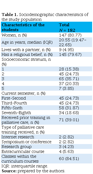 Of the 242 eligible Nursing students, 182 (75.21%) participated in this study. A total of 80.77% were women, with a median age of 20.55 years (interquartile range [IQR] = 19.47–22.65). Most were enrolled in the fifth or sixth semester (31.87%); 79.67% reported having some religious belief, and 39.01% reported having received prior training in PC (Table 1).