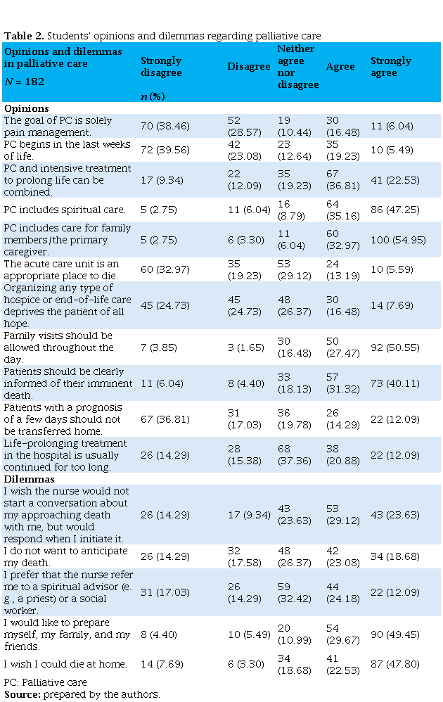 Source: prepared by the authorsRegarding opinions about PC, the median for the overall average of the 11 assessed opinions was 3.18 (IQR = 2.91– 3.45). More than 30% of the students reported strongly disagreeing with statements such as “The goal of PC is solely pain management” (38.46%) and “PC begins in the last week of life” (39.56%). In contrast, more than half of the students reported strongly agreeing with statements such as “PC includes caring for family members/the primary caregiver” (54.95%) and “Family visits should be allowed all day” (50.55%). The median for the overall average of the assessed dilemmas was 3.60 (IQR = 3.00– 4.20). A total of 49.55% indicated that they strongly agreed with the dilemma “I would like to prepare myself and my family and friends,” and 47.80% with “I wish I could die at home” (Table 2).
