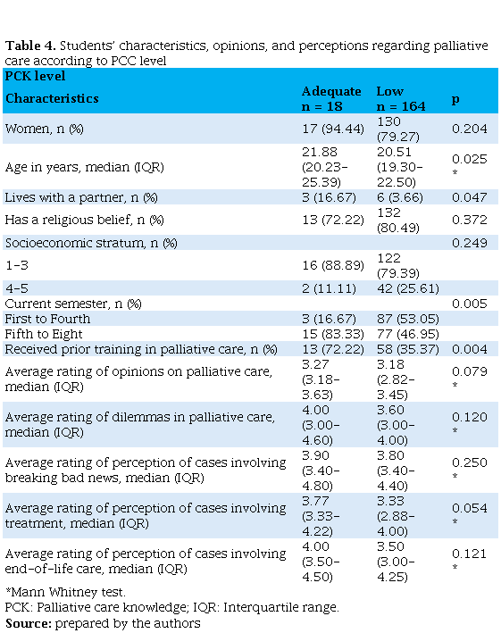 Source: pprepared by the authorsNo statistically significant differences were observed in the sex distribution between the groups of students with adequate PCK compared with those with low PCK (p = 0.204). Statistically significant differences were found between the groups in the characteristics of living with a partner (16.67% adequate PCK versus 3.66% low PCK, p = 0.047), being enrolled between the fifth and eighth semesters (83.33% adequate PCK versus 46.95% low PCK, p = 0.005), and having received prior training in PC (72.22% adequate PCC versus 35.37% low PCK, p = 0.004) (Table 4).