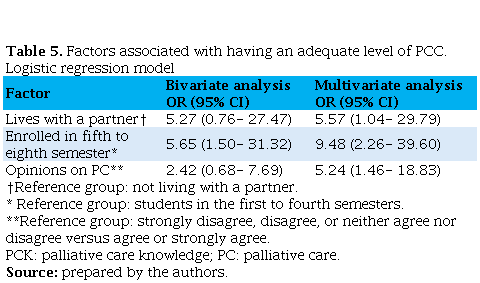 Resumo: Introdução. As lacunas na assistência em cuidados paliativos (CP) em países de baixa e média renda podem estar relacionadas, entre outros fatores, à insuficiente capacitação dos profissionais de enfermagem. O objetivo deste estudo é identificar os fatores associados a um nível adequado de conhecimento sobre CP em estudantes de enfermagem de uma universidade da Colômbia. Metodologia. Estudo transversal com 182 estudantes de Enfermagem. Considerou-se como variável dependente o nível adequado de conhecimentos sobre cuidados paliativos (CCP). As variáveis sociodemográficas, acadêmicas e percepções em CP foram avaliadas como fatores potencialmente associados. A população e as percepções foram caracterizadas por meio de estatística descritiva e regressão logística múltipla para identificar os fatores associados. Resultados. Dos estudantes, 9.89% apresentaram um nível adequado de conhecimentos em CP. Foram identificados como fatores associados estar cursando entre o 5º e o 8º semestre (OR = 9.48, IC95% = 2.26-39.60), viver com parceiro(a) (OR = 5.57, IC95% = 1.04-29.79) e concordar predominantemente com as opiniões em CP (OR = 5.24, IC95% = 1.46-18.83). Discussão. O nível de conhecimento em CP identificado é semelhante ao relatado em estudos anteriores na Colômbia. Os fatores associados são consistentes com os descritos em outros contextos. Neste estudo, o sexo e as crenças religiosas não foram associados a um nível adequado de conhecimento em CP. Conclusões. Menos de 10% dos estudantes de Enfermagem têm um nível adequado de conhecimentos em CP. É necessário ajustar o currículo de Enfermagem considerando as percepções dos estudantes sobre CP, para capacitá-los adequadamente em CP, especialmente aqueles que se encontram entre o primeiro e o quarto semestre.