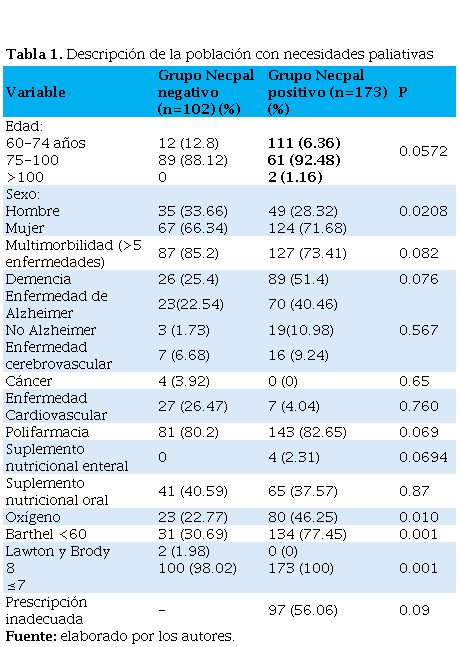 La variable dependiente fue la necesidad de atención paliativa, identificada con el instrumento NECPAL. El instrumento NECPAL es una herramienta clínica diseñada para la identificación precoz de personas con enfermedades crónicas avanzadas que tienen necesidades de atención paliativa. La calificación e interpretación del instrumento se basa en un algoritmo sencillo, diseñado para identificar proactivamente a pacientes con enfermedades crónicas avanzadas que se beneficiarían de un enfoque de atención paliativa. No es una escala numérica compleja, sino una combinación de criterios que, al cumplirse, califican al paciente como NECPAL positivo (6).
