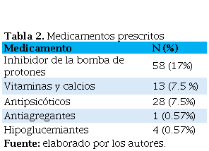 Entre los medicamentos más prescritos estaban los inhibidores de bombas de protones, vitaminas, calcio y antipsicóticos (Tabla 2).