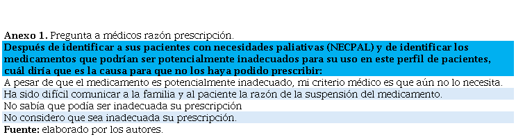 Después de haber identificado los pacientes con necesidades paliativas y revisar la prescripción utilizando la estrategia STOPP-PAL, se realizó una encuesta a los médicos tratantes para establecer las causas de permanecer con esta prescripción (Anexo 1). La mitad de los médicos tratantes refieren que a pesar de que el medicamento es potencialmente inadecuado, su criterio médico es que aún lo necesita y el otro 50% respondió que había sido difícil comunicar a la familia y al paciente la razón de la suspensión del medicamento. En este caso ninguno respondió que no sabía que podía ser inadecuada la prescripción. Ninguno de los encuestados consideró que no fuera inadecuada su prescripción.