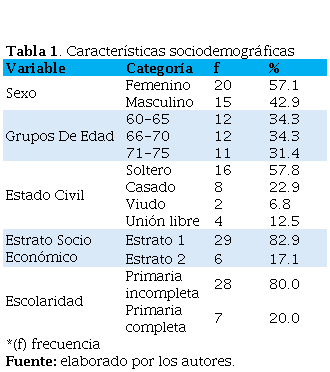 Primera fase. Con relación al perfil sociodemográfico de las 35 personas mayores, se encontró que el promedio de edad fue de 68 años, con un dato mínimo de 60 años y un máximo de 75 años; en cuanto al estado civil, el 64.6% estuvo sin pareja, y el 35.4% con pareja. En cuanto al estrato socioeconómico, el 82.9% pertenecía al 1; y el 17.1%; al 2. En lo que respecta al nivel de escolaridad, el 80% cursó hasta 4° de primaria, ninguno tenía estudios de secundaria (Tabla 1).